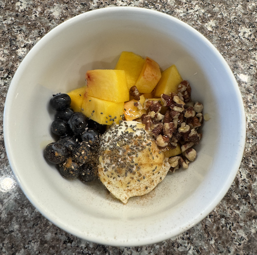 This blueberry, peach and yogurt combo is one of my quick breakfast recipes. You can substitute with any fruit but peach and blueberries have been our favorite lately.